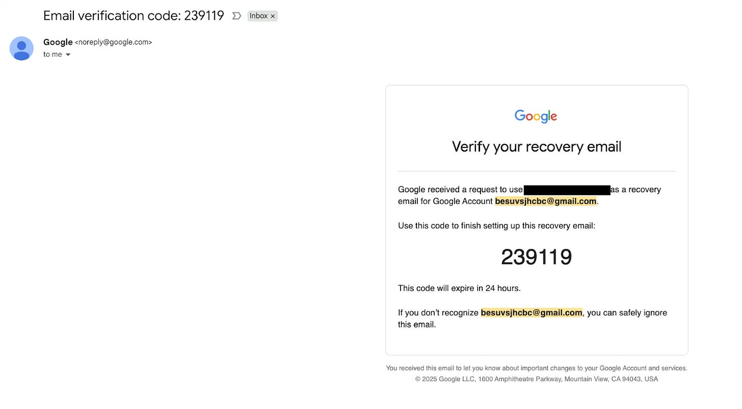 Avec le recul, la manière dont ils ont procédé est évidente. Les escrocs avaient créé un compte sous le nom besuvsjhcbc@gmail.com. Ils ont ensuite simplement demandé à Google d’utiliser mon adresse e-mail comme compte de récupération pour leur compte. Cela a généré une demande authentique de la part de Google, habilement programmée pour donner l’impression qu’elle ne pouvait provenir que d’une personne travaillant pour l’entreprise.